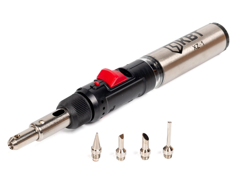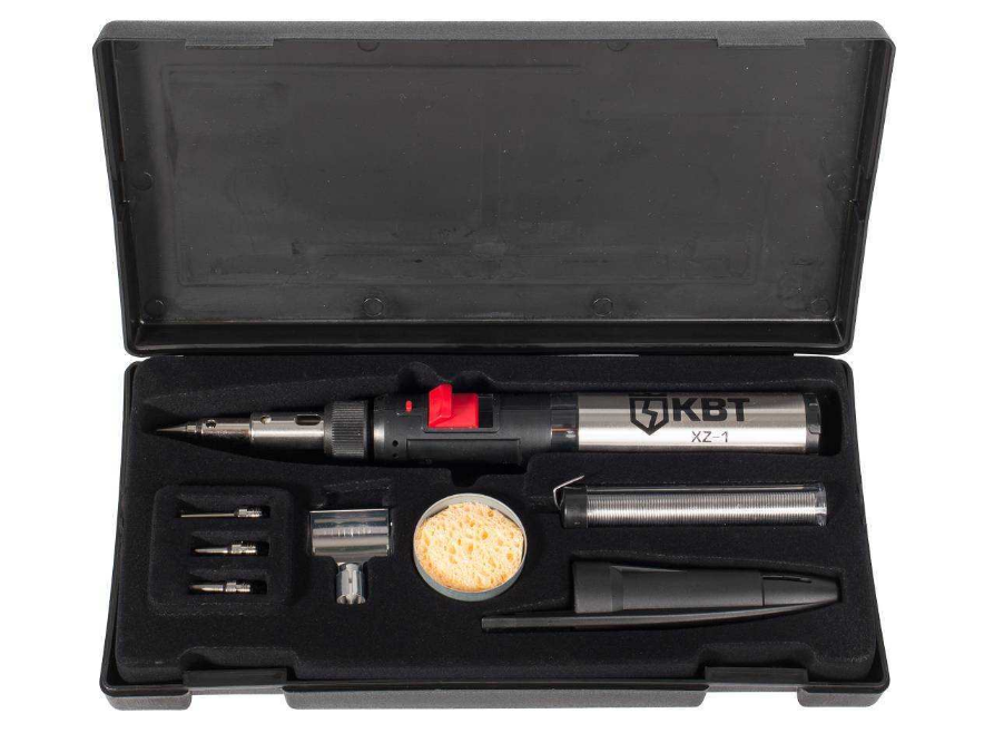 - В комплекте: газовый паяльник, защитный колпачок, насадки для пайки, губка, припой, дефлектор