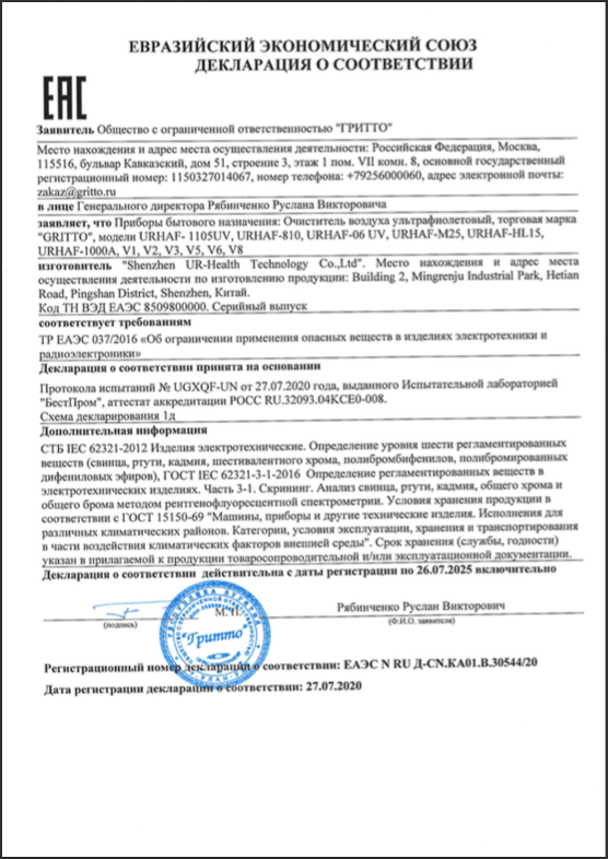Очиститель воздуха ультрафиолетовый Gritto V5 очищает воздух и на 99,9% уничтожают: