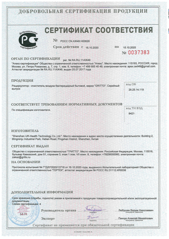 Обеззараживание происходит благодаря прохождению воздуха через несколько уровней фильтрации и ультрафиолетовые (УФ) лучи лампы, встроенной в прибор. УФ-лампа закрыта защитным корпусом, что позволяет пользоваться устройством в присутствии людей. Не выделяет озон. При этом бактерицидным воздействием обладает только УФ излучение с длиной волны от 205 до 315 HM. Бактерицидный эффект ультрафиолетовых ламп основан на том, что излучение этого спектра повреждает ДНК клеточного ядра микроорганизма. Длина волны лампы, установленной во всей линейке рециркуляторов воздуха Гритто, равна 254 HM.